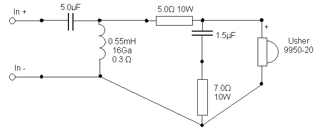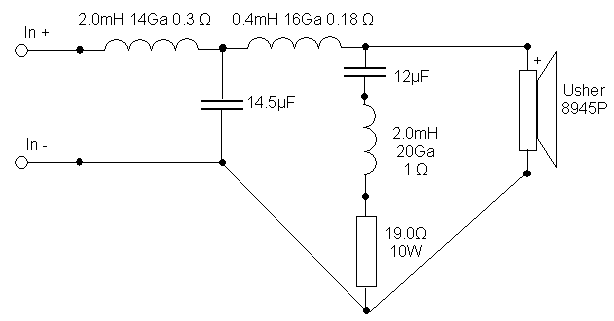This is a 3rd order LP electrical filter, which results in an 4th orderish LR acoustic filter at 1900Hz. The RLC shunt elements are used to equalize the 1Khz peak in the woofers response. Other than this peak, the upper cone break-ups at 2.8Khz and 4Khz of 8945P are better behaved than 8945W